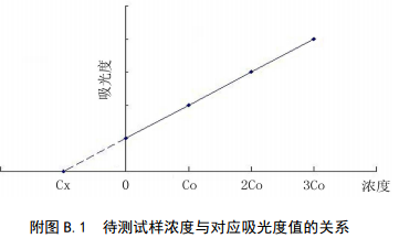 分別量取4等份量待測試樣(濃度為Cx),配制總體積相同的4份溶液。第一份不加標(biāo)準(zhǔn)溶液,第二、三、四份分別按比例加入不同濃度的標(biāo)準(zhǔn)溶液,4份溶液的濃度分別為:Cx、Cx+Co、Cx+2Co、Cx+3Co,加入標(biāo)準(zhǔn)的最小濃度Co≈0.5Cx。用空白溶液調(diào)零,在相同條件下依次測定4份溶液的吸光度值。以吸光度值為縱坐標(biāo),加入標(biāo)準(zhǔn)溶液的濃度為橫坐標(biāo),繪制校準(zhǔn)曲線,曲線反向延伸與橫坐標(biāo)的交點(diǎn)即為待測樣品的濃度。該方法只適用于濃度和吸光值呈線性的區(qū)域。待測試樣濃度與對應(yīng)吸光度值的關(guān)系見附圖A.1。