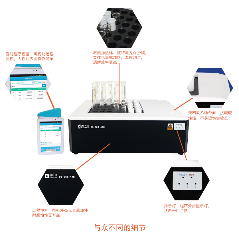 DS-360-42H石墨消解儀采用高純石墨材料作為加熱體,包裹式加熱,效率更高,溫度均勻性更好;多孔設計,輕松實現樣品的批量處理,是您樣品消解的好伴侶。
