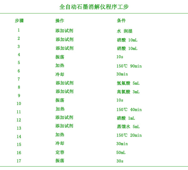準確稱取0.5g(精確至0.0001g)試樣于全自動石墨消解儀特氟龍消解管內,并置放到全自動消解儀石墨孔中,進行編號。用少量水潤濕后,加入硝酸和鹽酸各10mL,振搖10s,在150℃溫度下加熱90min;冷卻30min后,加入5mL氫氟酸和3mL高氯酸,振搖10s,在150℃溫度下加熱40min;再加入1mL硝酸和5mL蒸餾水,在150℃溫度下繼續加熱20min;冷卻30min,用蒸餾水定容至50mL,振搖30s。全自動石墨消解儀程序消解步驟如下: